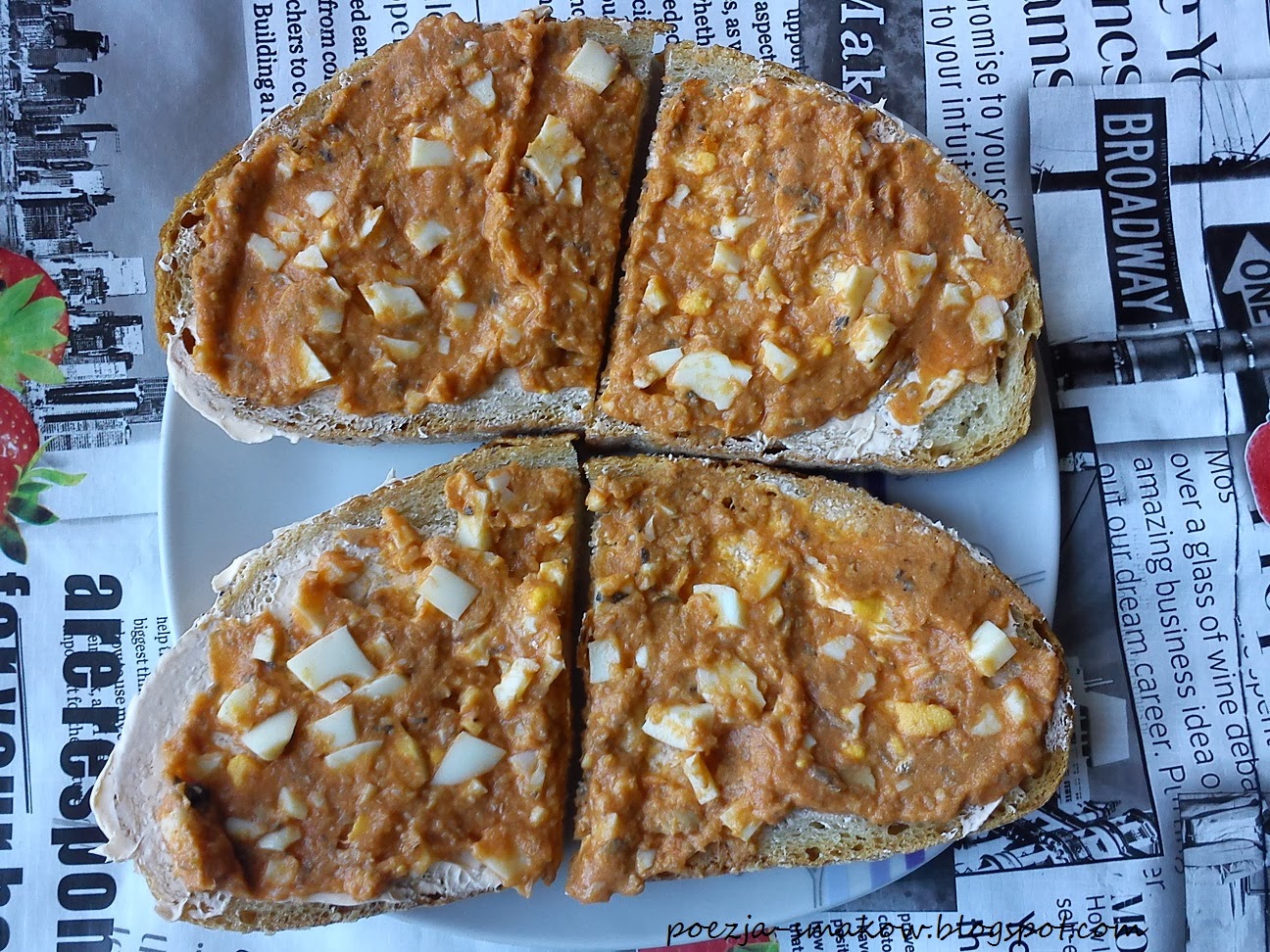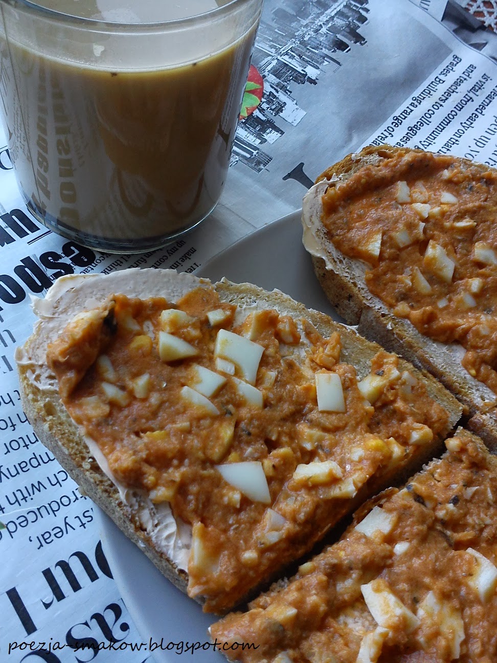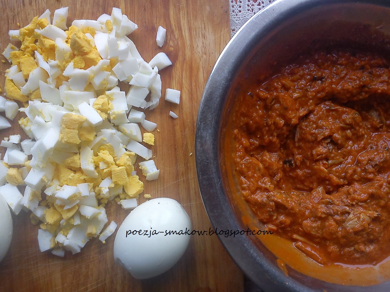 Tuńczyka wraz z sosem pomidorowym wylać na miskę, widelcem dokładnie go rozgnieść. Jajka pokroić drobno, wrzucić do miazgi i wymieszać. Jeżeli ktoś lubi bardzo drobne pasty, można zblendować. Dołożyć łyżkę ketchupu lub przecieru, i doprawić do smaku według uznania. Ja jak daje ketchup, to już raczej nie doprawiam.