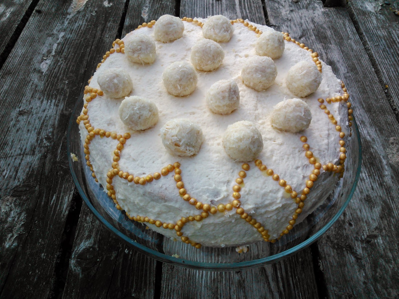 Taki tort to tort na specjalne okazje 🙂 jest dość drogi ale smak jest po prostu bajeczny – delikatny słodki, rozpływający się w ustach. Trzeba go spróbować! Wielbiciele Pralinek Raffaello powinni być nim zachwyceni. Kombinacje kremów, ozdób to moja koncepcja – oczywiście można troszkę je zmodyfikować według własnego uznania.