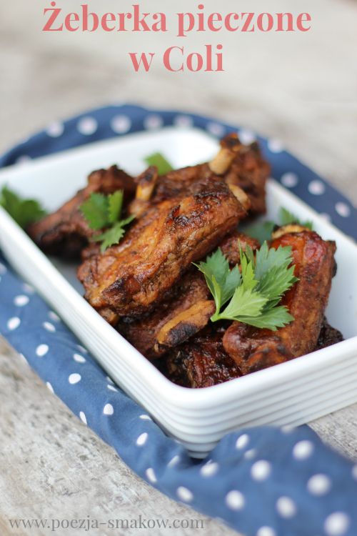Od kiedy zobaczyłam w książce Nigelli przepis na szynkę w Coli, wiedziałam że kiedyś upichcę coś podobnego. Długo mi zeszło, bo książki już dawno nie mam, a co za tym idzie – tamtego przepisu też. Jednak nic straconego, bo osobiście uważam, że żeberka dużo lepiej zachowują się w pieczeniu niż szynka. Dobrałam przyprawy, zostawiłam mięso na noc w marynacie, podsmażyłam i włożyłam do piekarnika z dodatkiem Coli. Efekt przekroczył moje najśmielsze oczekiwania. Mięso wyszło niezwykle brązowe. Karmel zawarty w Coli jednak nie tylko zabarwił mięso, ale także nadał mu bardzo ciekawy słodkawy posmak. Dodatkowo – z zewnątrz mięso jest lekko chrupiące a wewnątrz delikatne i kruche. Jedne z lepszych żeberek jakie do tej pory miałam okazję zjeść 🙂