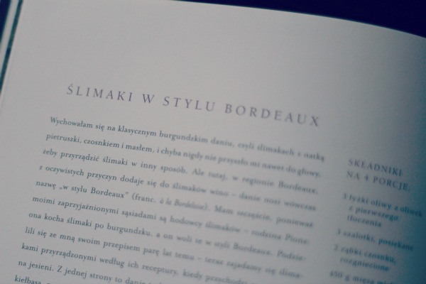 Jakie przepisy znajdziemy w książce? Jest to przede wszystkim kuchnia francuska. Znajdziemy tu sporo przepisów na tarty, przepis na ciasto francuskie, na ptysie, na owoce morza wszelakiej maści (np. na homara), zupy i inne typowo francuskie dania, których nazw wypowiedzieć nie umiem. Książka zawiera 94 przepisy i jest podzielona na 4 rozdziały. Wiosna, lato, jesień, zima. W każdym rozdziale znajdziemy stosownie do pory roku – przepisy na przystawki, dania główne i desery. Wiele z przepisów jest do wykorzystania przez każdego w kuchni codziennej. Wiele przepisów jest przedstawionych w sposób, który nie przyszedłby nam na myśl – na przykład gołąbki, zapiekane zupełnie inaczej niż nasze krajowe. Bo w tortownicy i krojone podobnie jak tort. Jakież to ułatwienie 🙂 Są też przepisy, jak ja to mówię, do których trzeba dojrzeć – czyli np. przepis na ślimaki – ale warto mieć gdzieś i taki przepis. Jedno jest pewne – z tej książki można dużo się nauczyć! Polecam!