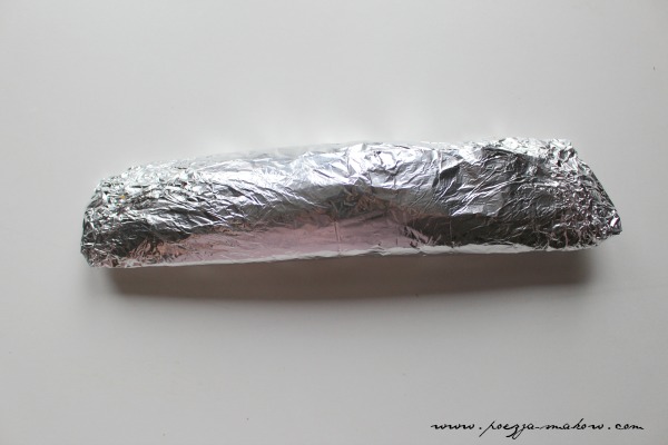 Folię posmarować musztardą. Mięso oprószyć solą a następnie rozłożyć na nim farsz. Zawinąć ciasno wzdłuż dłuższego boku, przełożyć na folię aluminiową. Roladę ciasno i dokładnie zawinąć we folię.