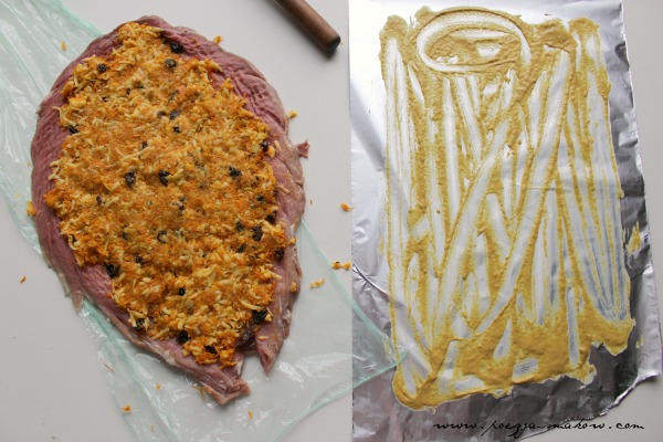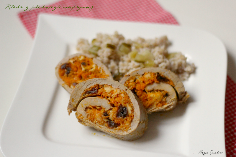 Kiedy kupuję polędwicę, to zawsze zastanawiam się jak ją najlepiej wykorzystać. Jest to najdelikatniejsze mięso z całej sztuki wieprzowej, więc potencjał tego mięsa można zaprezentować w bardzo różnorodny sposób. Z racji tego, że mięso jest miękkie, delikatne i kruche a co za tym idzie – szybko się upiecze i nie będzie suche, postanowiłam je użyć do zrobienia rolady. To, co dziś znalazło się w mojej roladzie to: marchew, korzeń selera, cebula, ser i garść rodzynek dla przełamania smaku. Całość otoczyłam musztardą, nadając lekko pikantnego smaku. Takie danie jest dobre na obiad, ale nie tylko. Rolada świetnie sprawdzi się pocięta w paski, jako przekąska, podana na zimno.