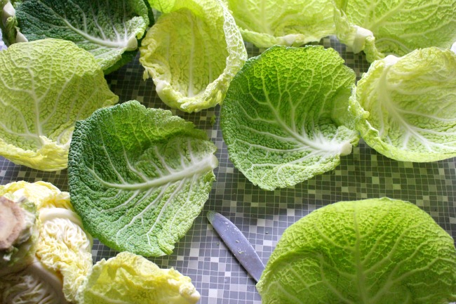 Nakładać farsz wewnątrz liścia, zawijać zgrabne gołąbki. Po zawinięciu ściąć na płasko trzonek liścia z zewnętrznej strony (tą część która bezpośrednio jest przyrośnięta do głębia), by gołąbek był zgrabniejszy i równo się ugotował.