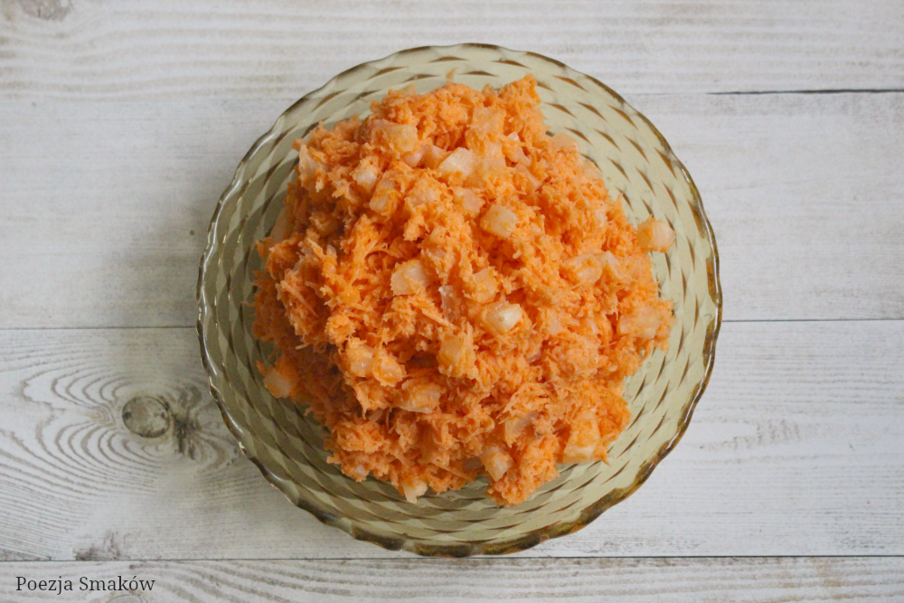 Marchew wyszorować, jeżeli zajdzie potrzeba to ją obrać. Jednak najlepiej pozostawić ją ze skórką – najwięcej przeciwutleniaczy znajduje się właśnie w niej. Zetrzeć ją na tarce o drobnych oczkach.