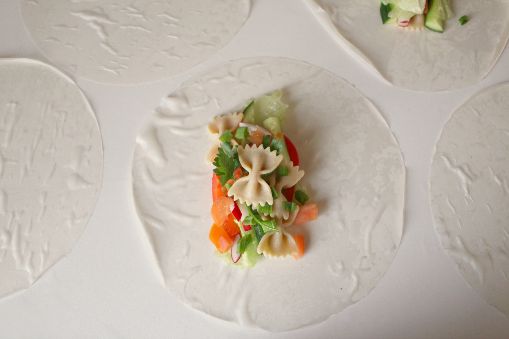 Papier ryżowy zamoczyć na 2-3 sekundy w letniej wodzie, odłożyć na talerz i poczekać chwilkę aż zmięknie. Na środkową część nakładać kolejno wszystkie składniki (ja zaczynałam od makaronu i natki pietruszki), następnie oprószyć sola i pieprzem. Papier zawijać w podłużne koperty dość ciasno – powinien bez problemu dobrze się trzymać, przykleić się wręcz do siebie. Dla pewności można rolki związać gałązką szczypiorku.