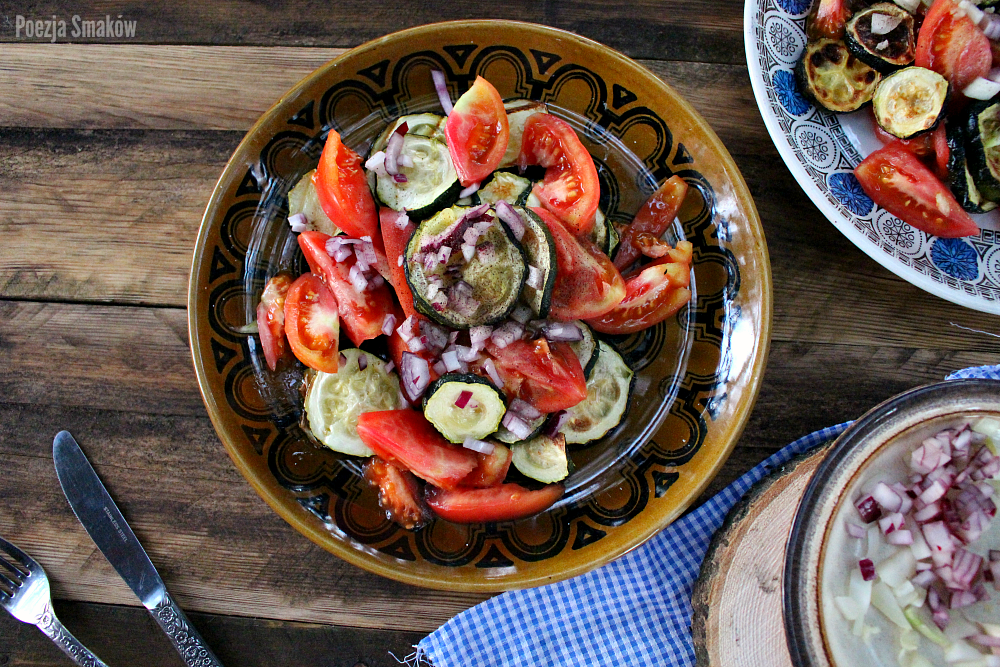 Uwielbiam pieczoną i grillowaną cukinię. Mogę jeść ją samą, najlepiej prosto z pieca, doprawioną tylko szczyptą soli. Zawsze przygotowuję ją tak, by skórka była twardsza, natomiast wnętrze było delikatne – wręcz kremowe. A kiedy zasiadamy do potraw z grilla i mam okazję podać ją z pieczoną kiełbasą czy mięsem, to staram się zawsze połączyć się ją z pomidorem i cebulą. Czasem dodaję odrobinę czosnku, ale świetnie sprawdzi się tutaj też sos czosnkowy najlepiej własnej produkcji. Powstaje bardzo prosta sałatka, która nie powinna czekać aż cukinia ostygnie – do podania na już 😉
