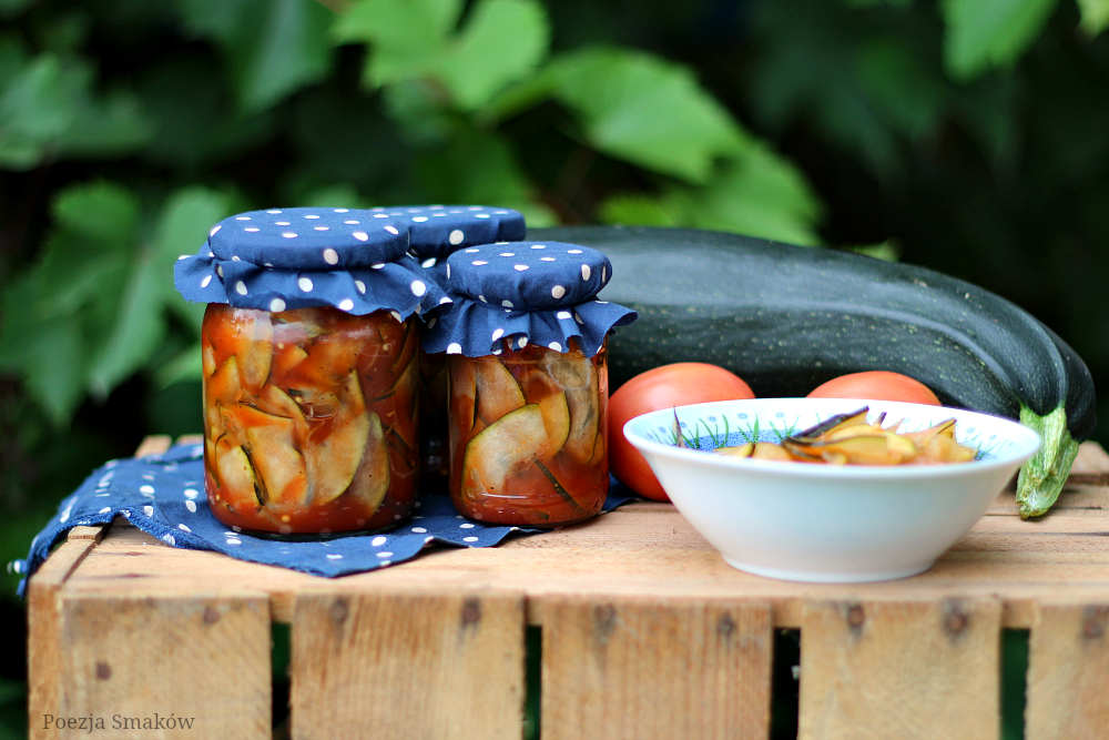 Cukinia w pomidorach, z czosnkiem, cebulą i przyprawami. Jak nic nasunęła mi się nazwa cukinia po diabelsku :-). Przepis skomponowałam tak, by była to lekko pikantna sałatka, ale można sobie regulować smak dodając więcej pieprzu cayenne czy czosnku, jednocześnie pozostawiając resztę składników w takiej samej ilości.
