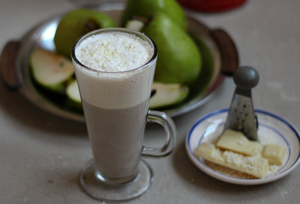 Otwieram oczy, spoglądam na zewnątrz przez okno… i co widzę? Śnieg! Tak moi drodzy, w Wielkopolsce miejscami zrobiło się biało… A więc do kubka gorącej porannej kawy dołożyłam sporo mlecznego puchu, białej czekolady i oczywiście syropu z sezonowych gruszek, by nadać kawie niepowtarzalny owocowy smak. I tak powstało idealne połączenie kawy z witaminami na chłodny dzień, spróbujecie? 🙂