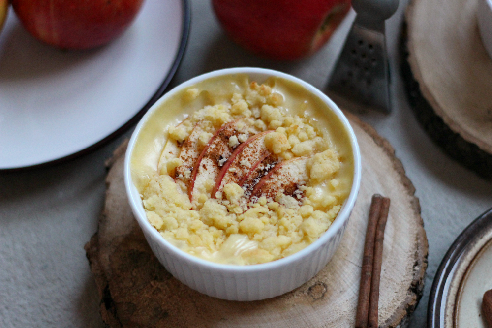 Pudding przelać do kokilek. Ozdobić jabłkami, posypać świeżo startym cynamonem i oprószyć delikatnie kruszonką.