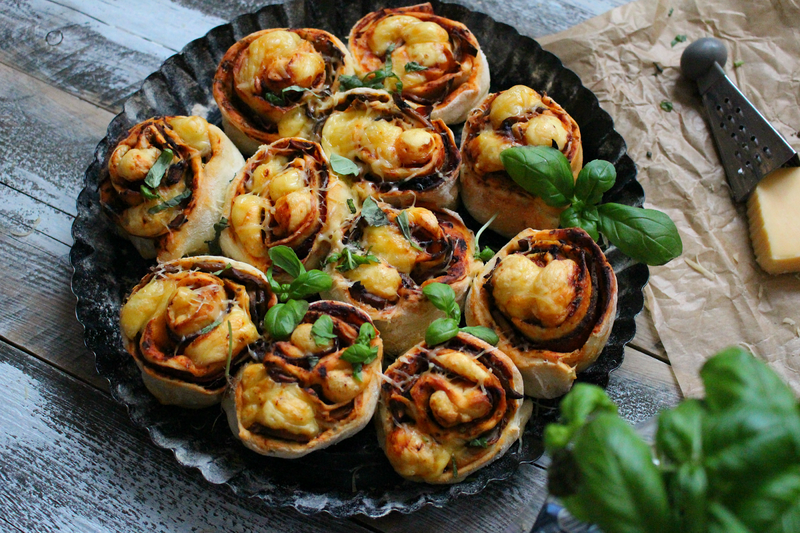 Kawałki pizzy układamy obok siebie, zostawiając 1 cm luzu na omączonej lub wyłożonej papierem do pieczenia blaszce. Każdą bułeczkę rozwieramy delikatnie na wierzchu i wsuwamy w jej warstwy ser – nie za głęboko. Chodzi o to, by te bułeczki nie były mocno ściśnięte od góry.
